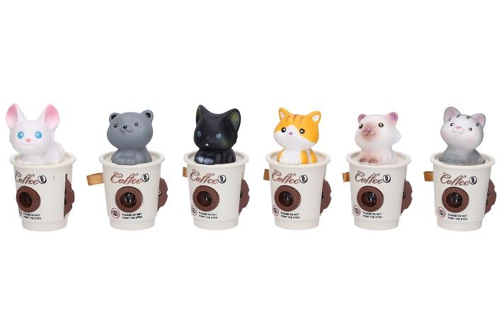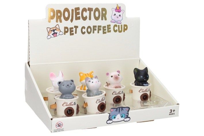 Projektor kočka. Velikost 8cm. baterie 3*AG13 součástí. Přepínač on/off. po zapnutí promítá projektor obrázky koček. Obrázky se mění kolečkem na boku. Ostření objektivu otáčením vepředu. 12ks display box, více variant