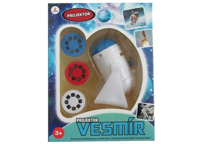 Projektor s 24 slidy s vesmírnými motivy. Balení obsahuje projektor, 3 kotouče s 24 slidy. Výrobek vyžaduje 3× AG13 baterie, které jsou součástí balení.