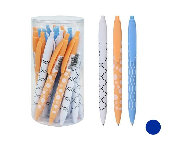 Kuličkový hrot- šíře stopy: 0,5mm- barva náplně: modrá- hladké psaní- inkoust s nízkou viskozitou- stiskací mechanismus- vyměnitelná náplň