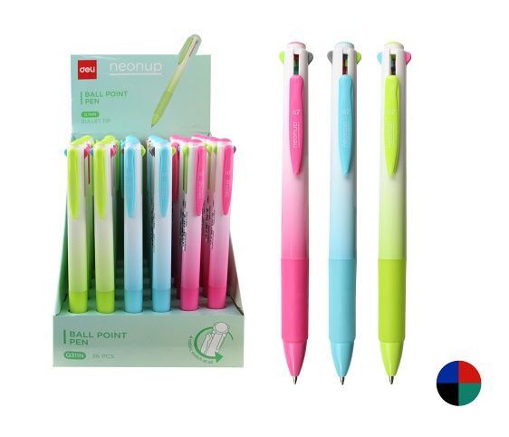 Kuličkový hrot- šíře stopy: 0,7mm- hladké psaní- inkoust s nízkou viskozitou- 4 barvy náplně- stiskací mechanismus