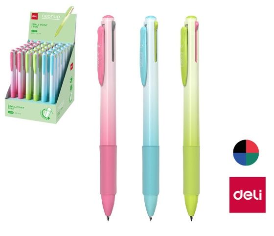 Kuličkový hrot- šíře stopy: 0,7mm- hladké psaní- inkoust s nízkou viskozitou- 4 barvy náplně- stiskací mechanismus