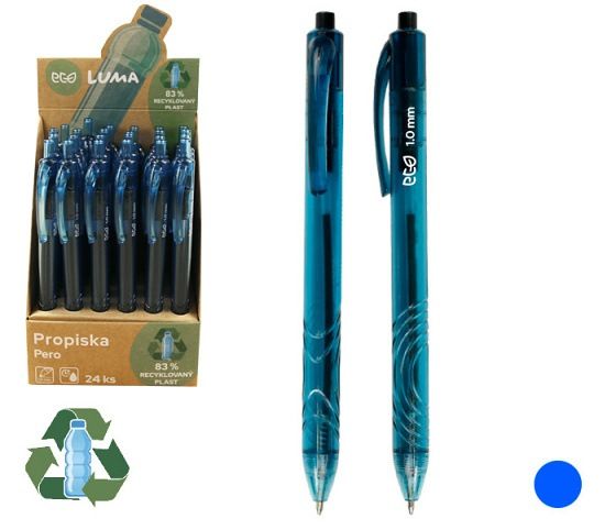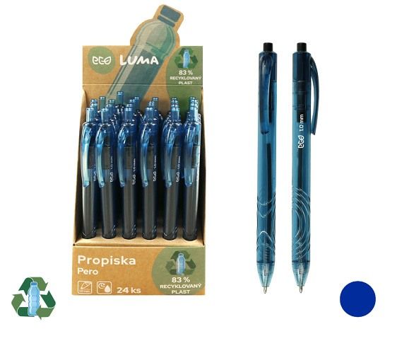Průhledné plastové tělo 83% recyklovaný plast r-PET- certifikace Global recycled standard- kuličkový hrot- šíře stopy: 1mm- barva náplně: modrá- stiskací mechanismus- měkký pogumovaný úchop