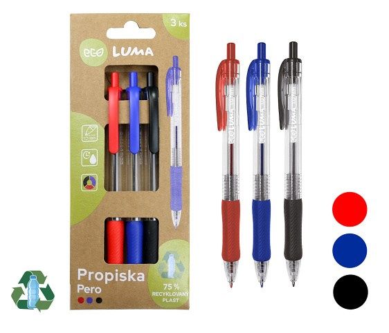 Sada 3ks propisek- plastové tělo vyrobeno ze 75% recyklovaného plastu- kuličkový hrot- šíře stopy: 1mm- barva náplně: modrá, černá, červená- hladké psaní- inkoust s nízkou viskozitou- stiskací mechanismus- měkký pogumovaný úchop- vyměnitelná náplň
