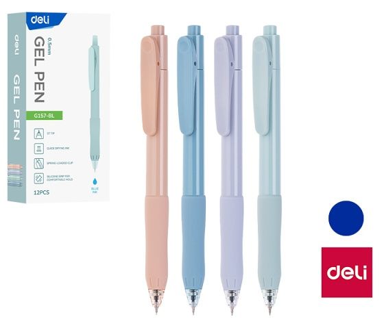 Tenký kuličkový hrot- šíře stopy: 0,5mm- barva náplně: modrá- gelová náplň- hladké psaní- inkoust s nízkou viskozitou- stiskací mechanismus- pevný plastový rozevírací klip- měkký pogumovaný úchop- vyměnitelná náplň