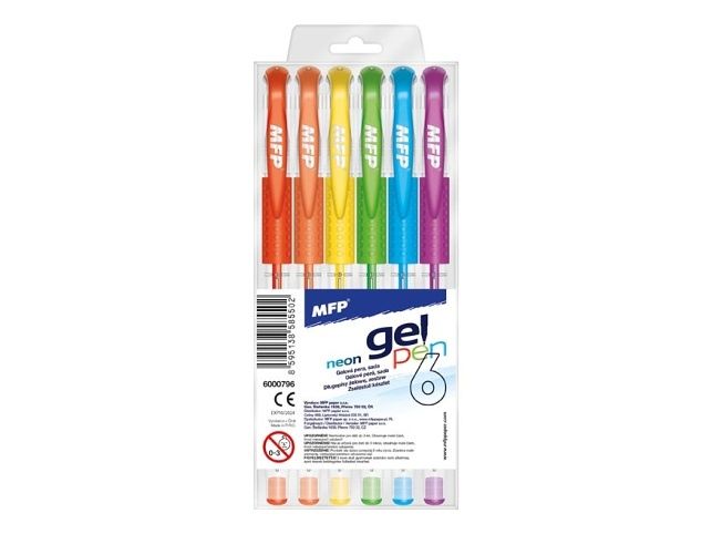 Set 6 ks gelových per v NEONOVÝCH barvách s hrotem 0.8mm - vhodná pro školní, kancelářské, ale i domácí použití. Gelové pero má pogumovaný úchop, a tak zabraňuje klouzání v ruce. Uvedená cena je za 1 sadu. Provedení: s vrškem Počet ks: 6 ks Barva: růžová, oranžová, žlutá, zelená, modrá, fialová Náplň: 5400152 Délka: 150mm Uvedená cena je za 1 balení po 6 ks.