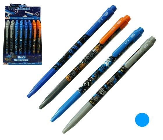 Hladké psaní- kuličkový hrot- šíře stopy 0,7 mm- modrá náplň- délka náplně 115 mm- stiskací mechanismus- plastový úchop- mix motivů