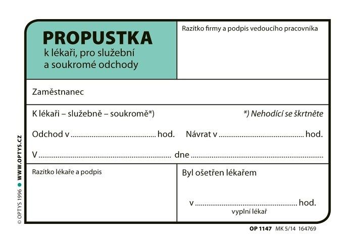 - PAPÍRNICTVÍ / TISKOPISY / MZDOVÉ A PERSONÁLNÍ / Propustky / A7 / OPTYS