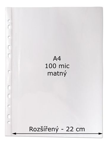 Rozšířený prospektový obal velikosti A4, šíře 22cm. Čirý, povrch matná krupice. Materiál polypropylen. Síla materiálu 100 mic. Baleno po 50 ks.