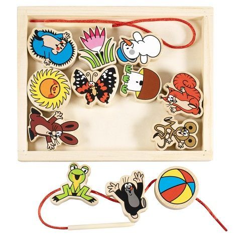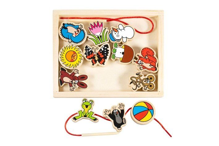 Dřevěné dílky s potiskem Krtka navlékáme na přiloženou šnůrku. Výrobek učí malé děti jemné motorice ruky, navlékání na šňůrku, vlastní kreativitě. V sadě 12 ks na navlékání a šňůrka.
