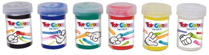 Souprava prstových barev v plastových kalíšcích. Jednotlivé barvy je možné míchat. Zasychají do 30 minut.