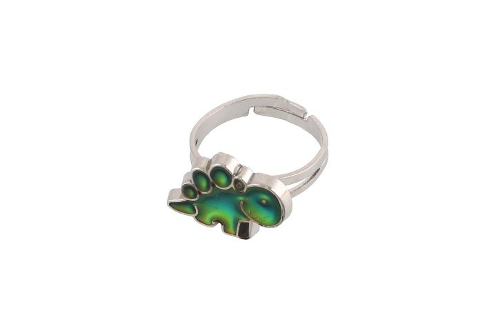 Nastavitelný kovový prstýnek s motivem dinosaura, který mění barvu podle teploty těla. Díky speciálnímu termoaktivnímu povrchu prstýnek reaguje na změny teploty a mění odstíny v barevném spektru. Zábavný a poutavý doplněk pro děti, který spojuje hravost s jednoduchým fyzikálním jevem.
