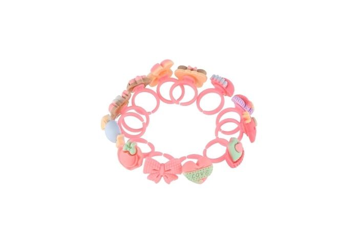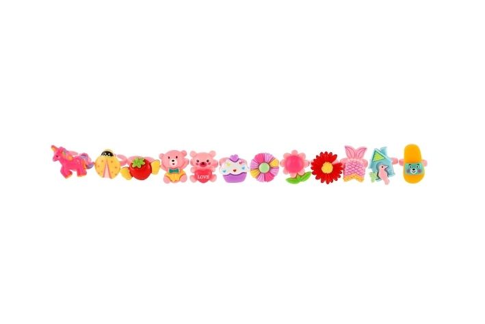 Sada pro každou malou princeznu, která chce mít prstýnků plnou ruku nebo prostě jen mít na výběr k jakémukoli outfitu! V sadě nalezneš 12 kusů originálních prstenů s různým motivem - od kytek přes ovoce, mašličky až po cucapky nebo zvířátka. Prstýnky mají nastavitelnou velikost.