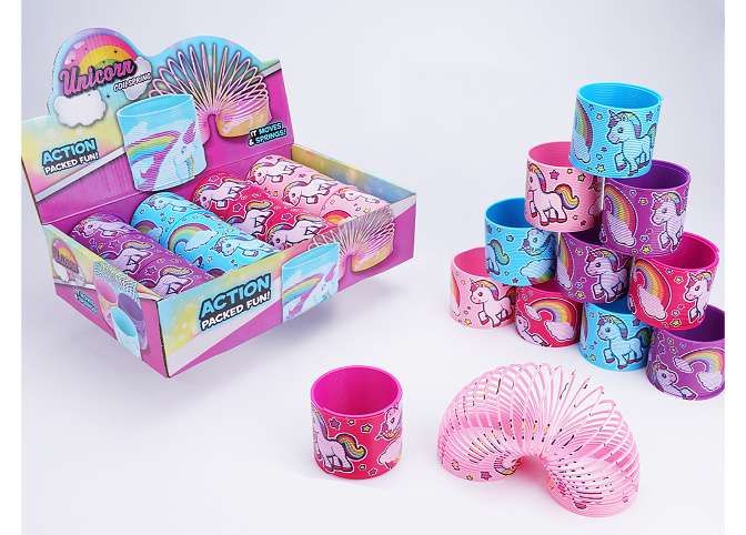 Pružina jednorožec. Přesné rozměry 7,6x7,6x6,5 cm. Display box 12 ks. 4 varianty - modrá, fialová, červená, růžová.