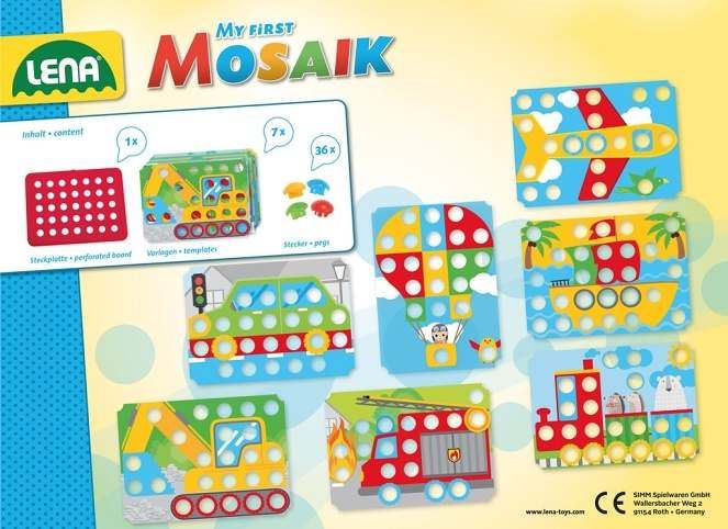 Mozaika určena nejmenším dětem. Díky velkým dírám a kolíčkům, nebudou mít malé ruce problém s umisťováním. Součástí balení je 7× barevná šablona (slouží jako předloha k umísťování kolíčků) , 36kolíčků. Velikost kolíčku 33mm průměr hlavy 20mm.