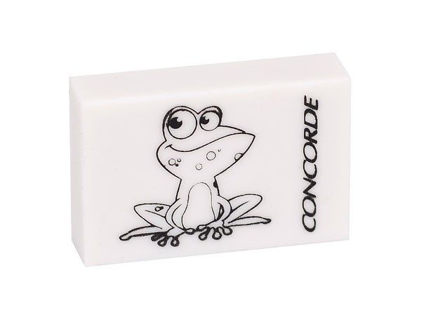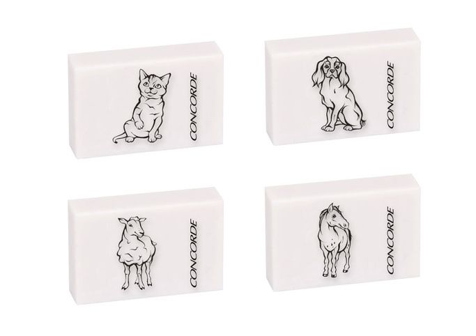 Bílá pryž s motivem zvířátek o rozměrech 3,3 x 2,2 cm. Dodávané v krabičce v mixu zvířátek (žába, kočka, pes, kůň, ovce).
