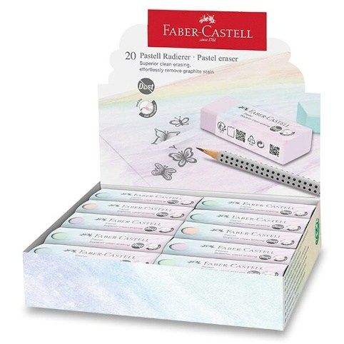 Kvalitní jednožmolková pryžFaber-Castell PVC-Free/Dust-Free Pastel vyrobena bez použití PVC je vhodná pro grafitovou tužku. Pryž je extra měkká pro efektivní a čisté mazání, má zkosené hrany pro přesnější mazání. Pryž je balená v kartonovém obalu.