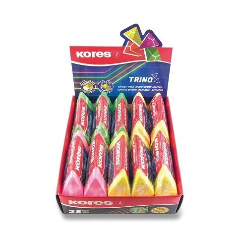 Kvalitní pryž Kores Trino Neon v neonových barvách, ergonomický trojhranný tvar. Neobsahuje brusné částice. Jemné a čisté gumování, nešpiní. Vhodná pro všechny typy tvrdosti grafitových tužek. Neobsahuje ftaláty a latex. Balená v kartonovém obalu.