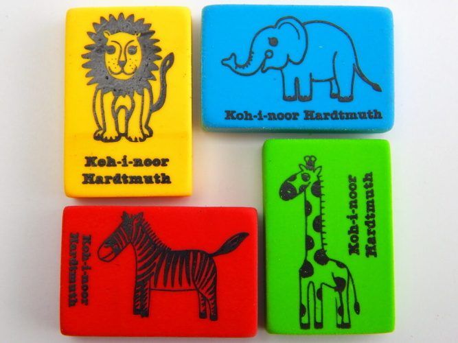 Plastická pryž netvárlivá, vhodná pro stírání grafitových čar. Hranatá, kvádrová, různé barevné modifikace, motiv obrázků - Afrika. Zelená pryž - obrázek žirafy, červená pryž - obrázek zebry, modrá pryž - obrázek slona, žlutá pryž - obrázek lva. Rozměr 35,5 x 23 x 8 mm.