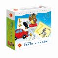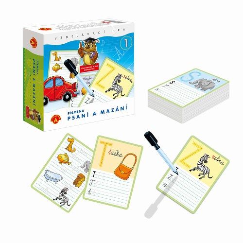 Vzdělávací hra, která děti od 5 let naučí kreslením po předloze správné tvary písmen, u kterých se nacházejí obrázky, což velmi napomáhá i při výuce čtení. Současně zdokonaluje manuální zručnost a správné držení pera. Texty lze opakovaně psát a mazat. Hračka se skládá z 28 naučných motivů a zadání na 14 tabulkách a mazacího fixu. Na každém z 28 motivů se nachází jedno z písmen abecedy. Tři řádky obsahují prostor pro psaní tří různých variant daného písmene, nebo jednoduchá slova na procvičení. Každé písmeno obsahuje pomocnou přerušovanou čáru, která pomáhá při kreslení jeho tvaru. Na všechny kartičky s úkoly lze psát a malovat fixem. Napsané texty lze snadno smazat speciální koncovkou na násadce fixu. Děti mohou opravovat chyby a používat tabulky opakovaně. Psaní a mazání - PÍSMENKA je výborná zábava a výuka současně.Vzdělávací hra, která děti od 5 let naučí kreslením po předloze správné tvary písmen, u kterých se
