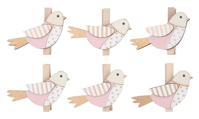 Dřevění ptáčci na kolíčku Kolíčky využijete k dekorování věnců či vazeb, nebo je můžete připnout třeba na větvičku. Vytvořte si doma s jejich pomocí tu správnou jarní atmosféru, skvěle se kombinují s položkou č. 7468 a 7478. Jemný moderní motiv, 6 kusů v balení.