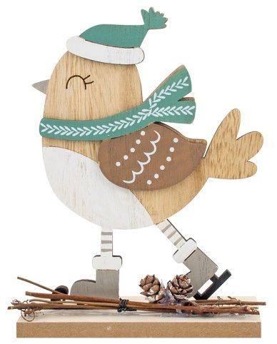 Ptáček dřevěný se šálou a kulichem na bruslích 13 x 18 cm