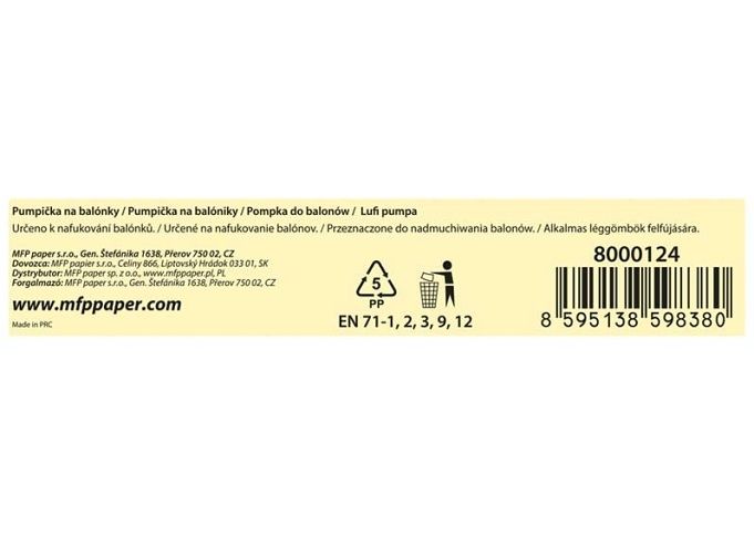 Plastová pumpička na nafukovací balónky. Udělejte si parádní párty výzdobu s nafukovacími balonky, čím více balonků, tím lépe. Nebojte se, nafukování bude hračka s jednoduchou, mechanickou pumpičkou. Dodáváme v muxu barev Uvedená cena je za 1 ks Varování: Nevhodné pro děti do 3 let. Děti se mohou prasklými či vyfouknutými balónky zadusit nebo uškrtit. Používejte pouze pod dozorem dospělé osoby. Dospělá osoba se po nafouknutí balónku musí přesvědčit, že jej děti používají bezpečně. Vyfouklé balónky udržujte mimo dosah dětí a prasklé ihned zlikvidujte. K nafukování balónků použíjte pumpičku. Nepřibližujte balónky k očím a obličeji. Při prasknutí může balónek způsobit zranění. Vyrobeno z přírodního kaučuku, latexu. Určeno k dekorativním účelům.
