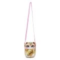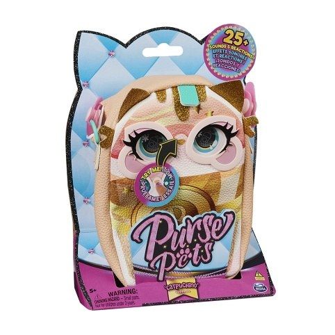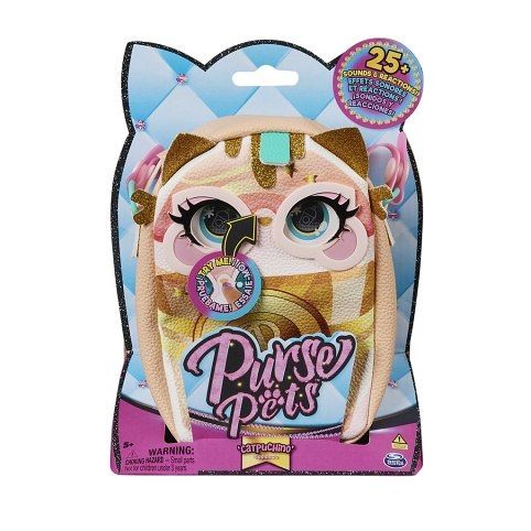 Interaktivní kabelka Kotě/Kapučíno má veliké třpytivé oči a mění barvu tváří podle své nálady. Je vyrobena z kvalitní umělé kůže se spoustou krásných detailů. Pomocí různých dotyků aktivuj až 25 různých zvuků a reakcí.Velikost cca 17×10×5 cm. Vhodné od 5 let. Na baterie: 3x LR44 (jsou součástí balení)