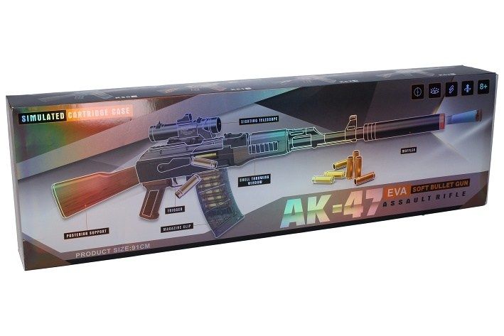 Puška AK-47 s patronami a pěnovými náboji. Velikost 91 cm. Puška rozložitelná na jednotlivé části. Součástí tlumič, hledí, 8 patron, 20 pěnových nábojů (10 standardních, 10 s přísavkou). Návod s obrázky a instrukcemi na sestavení a používání na zadní straně obalu.