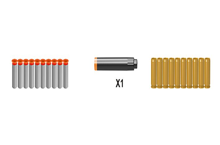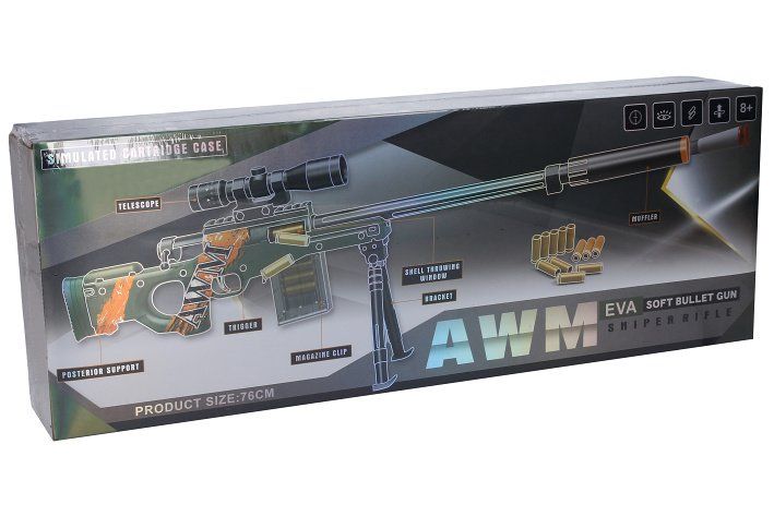 Puška AWM s patronami a pěnovými náboji. Velikost 76 cm. Puška rozložitelná na jednotlivé části. Součástí stojánek, tlumič, hledí, 10 patron, 10 pěnových nábojů. Návod s obrázky a instrukcemi na sestavení a používání na zadní straně obalu.