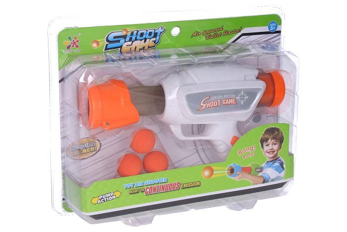 Puška pumpující s pěnovými míčky. Rozměry 23x6x14,5 cm.