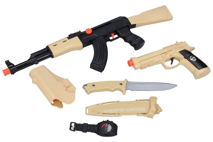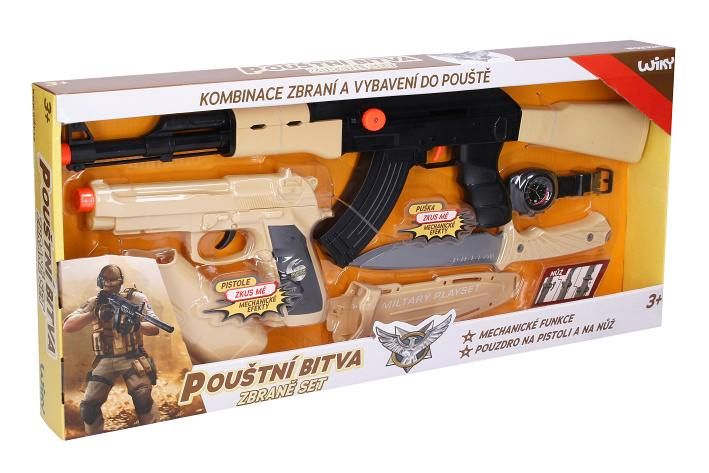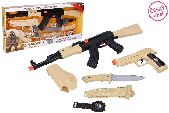 Puška sada pouštní bitva. Obsah balení - samopal 52 cm, pistole s pouzdrem 20 cm, nůž s pouzdrem 25 cm, hodinky. Samopal a pistole vydávají akustické zvuky při stisku spouště, bez baterií. Samopal se nabíjí páčkou na levé straně.