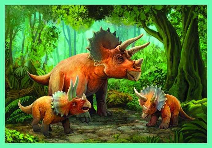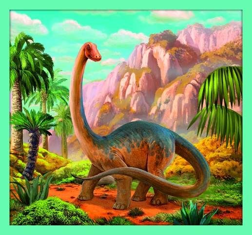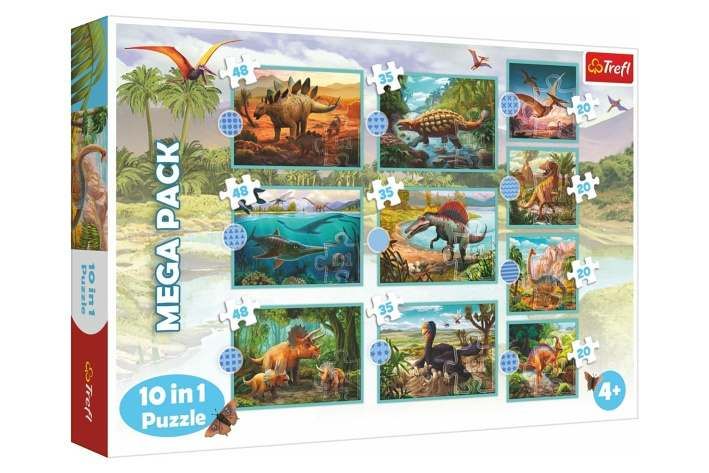 Puzzle s motivem oblíbených dinosaurů. Deseti samostatných puzzle s různým počtem dílků - 4x20, 3x35, 3x48 - postupně vedou ke zdokonalování dítěte při skládání a zvyšování obtížnosti. Velikost složeného obrázku (4x20 dílků) je 16,7 x 15,6 cm, velikost složeného obrázku (3x35 a 3x48 dílků) je 22,3 x 15,6 cm.