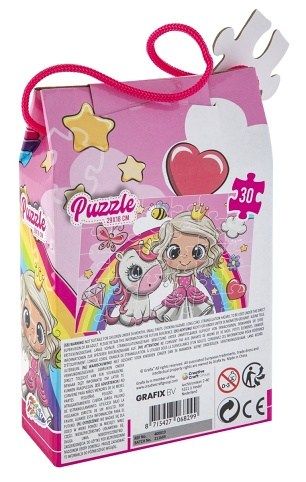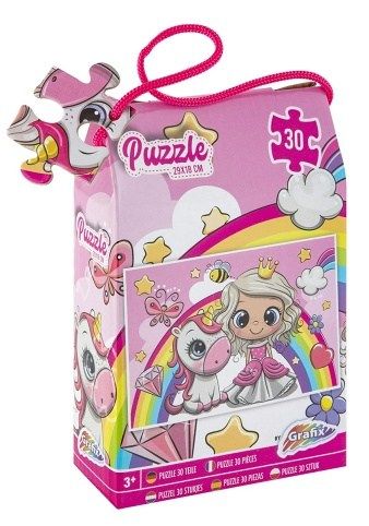 Nádherné dětské puzzle obsahující 30 velkých dílků, které po složení vytvoří obrázek s motivem princezny a jednorožce o rozměru 29x18 cm, baleno v krásné dárkové krabičce s uchem