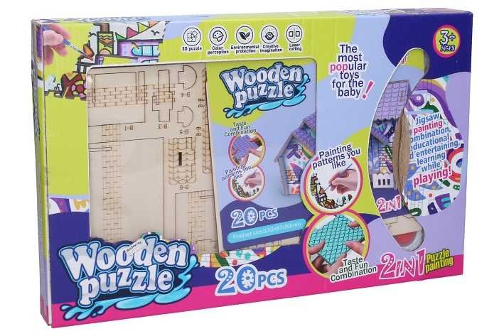 Puzzle 3D dřevěné dům s barvami. Rozměry složeného domu: 13,1x9,7x9,6cm. Obsahuje 3D puzzle, barvy, štětec, obrázkový návod.