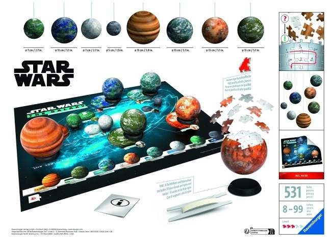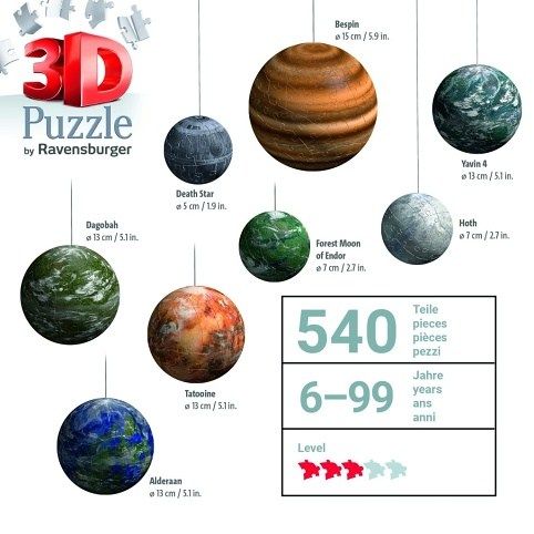 Původní trilogie Star Wars ožije u vás doma! Sestavte si vlastní soustavu 8 nejvýraznějších planet z Galaxie Star Wars z kvalitních plastových 3D Puzzle dílků. Realistické modely planet Hvězda smrti, Endor, Hoth, Yavin 4, Tatooine, Alderaan, Dagobah a Bespin si snadno uspořádáte a vystavíte díky praktickým stojánkům a podkladu pro sestavení Galaxie Star Wars. Planety můžete také zavěsit ze stropu pomocí přiložené nylonové šňůry. Puzzle dílky do sebe přesně zapadají a drží pohromadě bez lepení díky patentované EasyClick technologii.