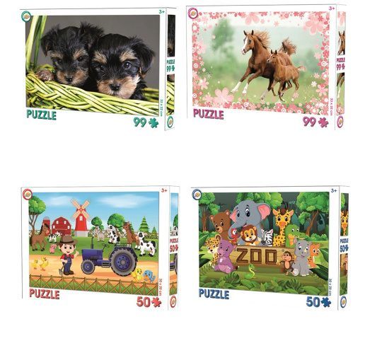 Puzzle 50 nebo 99 dílků 30x20 cm a 33x22 cm, 4 druhy. Nelze vybrat druh, dodáváme dle skladové dostupnosti.