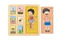 Puzzle lidské tělo má tři vrstvy. Zobrazuje strukturu těla ze svalů, orgánů a kostí. Děti mají možnost prozkoumat lidské tělo. Puzzle obsahuje 19 dřevěných dílů (včetně podložky).