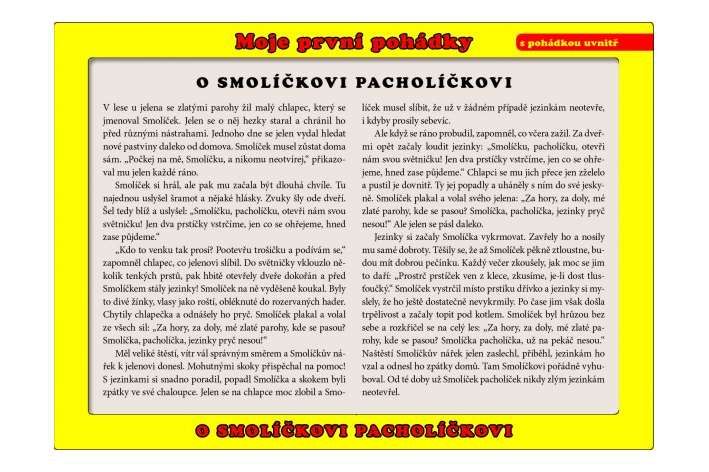 Deskové puzzle o rozměru 26x17cm s motivem pohádky O Smolíčkovi Pacholíčkovi. Pod obrázkem se na desce ukrývá pohádka o tomto chlapečkovi.