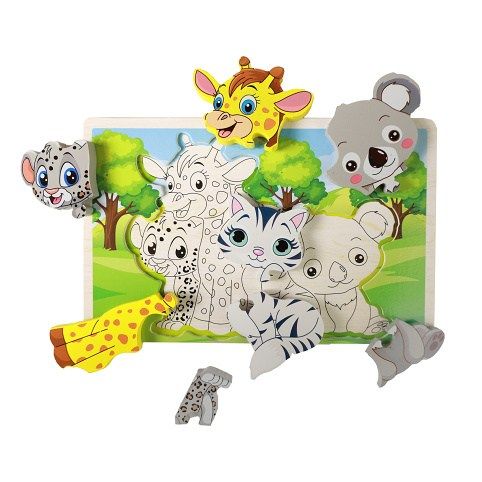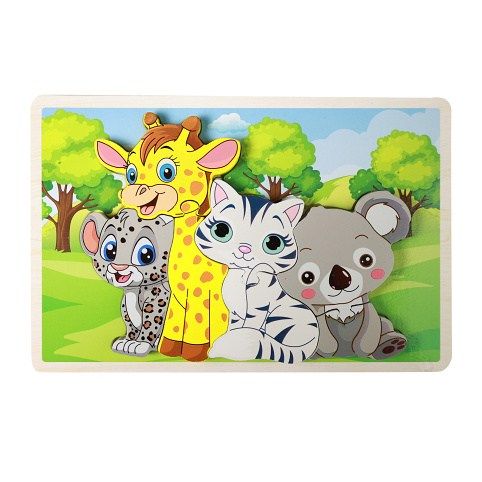 Dřevěné puzzle s motivem zvířátek pro naše nejmenší děti. Skládačka je vyrobena ze dřeva a obsahuje 8 dílků. Pestré barvy a veselá ilustrace podporují rozvoj fantazie, skládání procvičuje motorické vlastnosti a rozvíjí představivost.