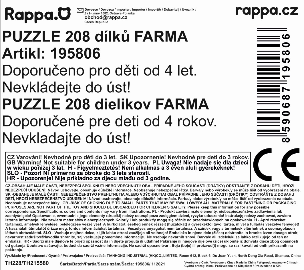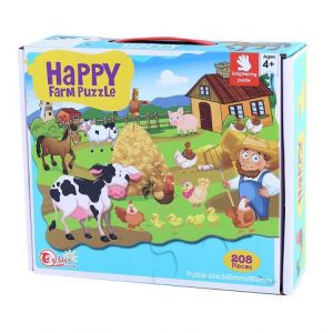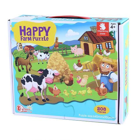 Puzzle šťastná farma nabízí dětem kreativní a chytrou zábavu. Z 208 velkých dílků si poskládají obrázek farmy včetně farmáře a jeho domácích zvířat. Přitom si budou rozvíjet fantazii, prostorovou představivost, trpělivost a jemnou motoriku. Skládačka je ideální pro děti od 4 let. Všechny části jsou z pevné lepenky. Poskládaný obrázek měří 64 x 90 cm.