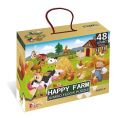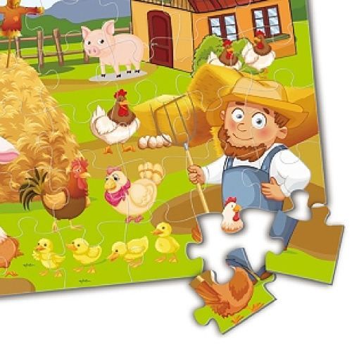 Podlahové puzzle pro děti s motivem zvířátek na farmě. Balení obsahuje 48 dílů, jednotlivé dílky jsou dost velké pro snadný úchop. Výsledný obrazec má velikost 90 x 60 cm. Vhodné pro děti od 3 let.