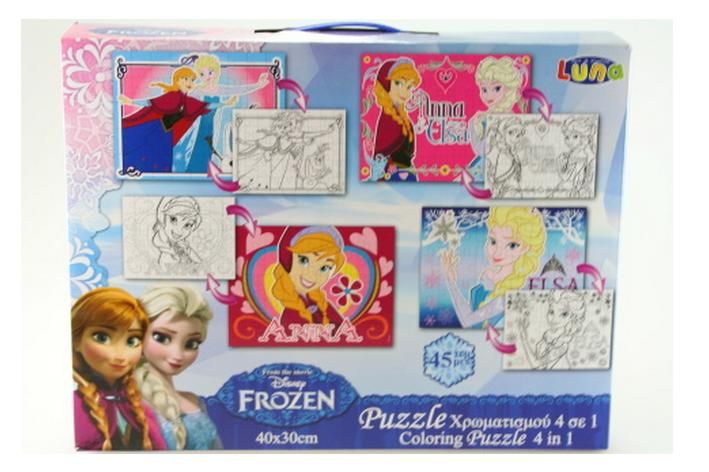 Puzzle Frozen 45 dílků 4 v 1 - obsahuje 4 druhy puzzlí po 24 dílcích o velikosti cca 6 cm X 8 cm s motivy Frozen.Z jedné strany je puzzle barevné a z druhé strany je černobílé - každý si může vybarvit dle vlastní fantazie.Rozměr balení cca 40 cm X 30 cm.Věk 3+