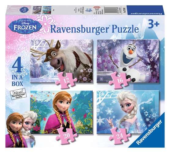 Puzzle s motivem Ledové království obsahují 4 obrázky po 12, 16, 20 a 24 dílkách.