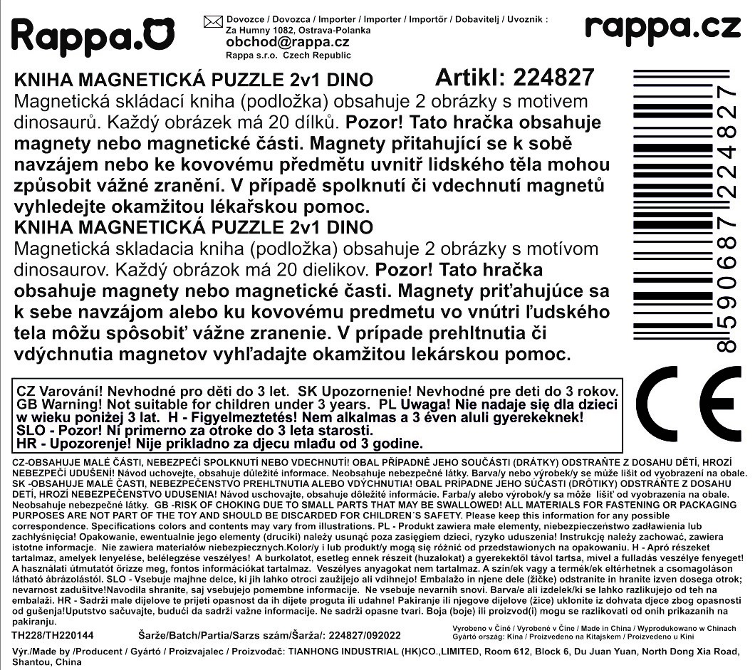 Magnetické puzzle s motivy dinosaurů. V této magnetické knížečce najdete dva různé obrazce k poskládání, každý z nich má 20 dílků. Jednotlivé dílky jsou dostatečně velké pro snadný úchop a na magnetické části skvěle drží.