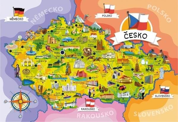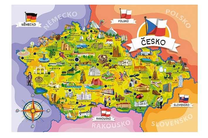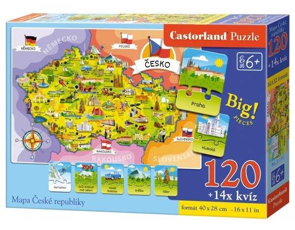 Toto puzzle představuje dětem zábavnou formou města České republiky. Každé místo je na mapě označeno obrázkem, který danou oblast vystihuje. Balení obsahuje 120 dílků puzzle a 14 kvízových dílků do páru. Úkolem je ke každému obrázku přiřadit správný název města. Děti si tak zábavnou formou mohou osvojit zeměpisné znalosti. Jednotlivé dílky jsou vyrobeny z kvalitního, pevného materiálu. Puzzle Česká republika: je vhodné pro děti od 6 let