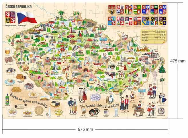 Milujete cestování a skládání puzzle? Pak je tato mapa České republiky přesně pro vás. Zeměpisné puzzle pro děti s mapou naší republiky a ilustracemi v podobě památek a turisty vyhledávaných míst. Puzzle vám pomohou naučit se jaké pamětihodnosti, stavby či přírodní útvary zde naleznou. Obrázky od českého výtvarníka. Počet dílků: 160 ks. Rozměr výrobku: 67,5x 47,5 cm. Rozměr balení: 31x22,5x7 cm. Věk: 3+