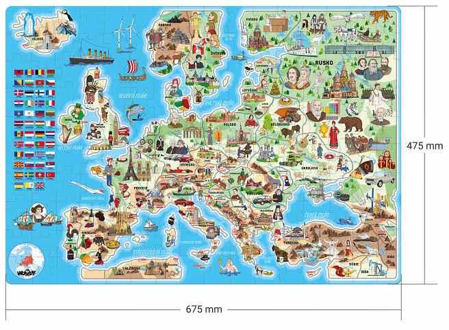 Milujete cestování a skládání puzzle? Pak je tato mapa Evropy přesně pro vás. Zeměpisné puzzle pro děti s mapou Evropy a ilustracemi v podobě světových památek a turisty vyhledávaných míst. Puzzle vám pomohou naučit se jaké pamětihodnosti, stavby či přírodní útvary zde naleznou. Obrázky od českého výtvarníka. Počet dílků: 160 ks. Rozměr výrobku: 67,5x 47,5 cm. Rozměr balení: 31x22,5x7 cm. Věk: 3+