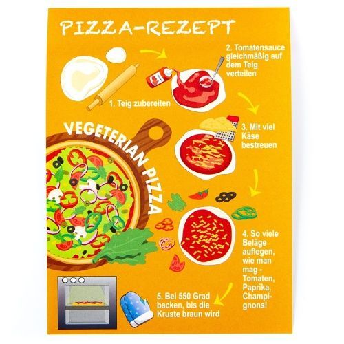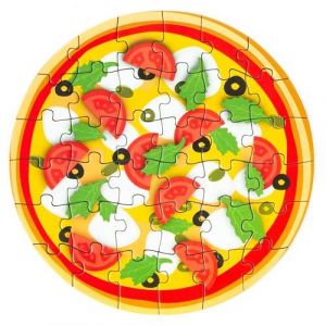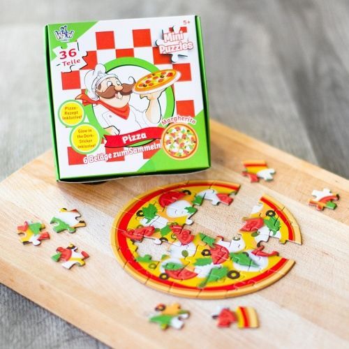 Puzzle mini Pizza 36 dílků. 6 různých druhů pizza – mexická, vegetariánská, margarita, feferonková, houbová a nejvzácnějí zlatá. Součástí balení je recept na pizzu a samolepka svítící ve tmě. Průměr obrázku 15 cm. Vyrobeno z ekologicky nezávadných materiálů.