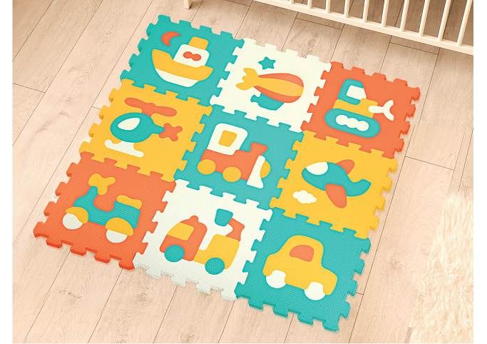 Puzzle pěnové doprava 9ks. Velikost 32x32 cm, tloušťka 1 cm. Pěnové puzzle s obrázky dopravních prostředků.