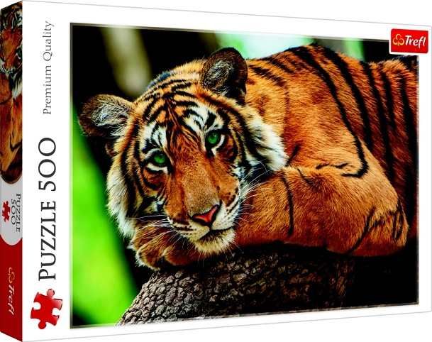 Puzzle 500 dílků představující fascinující portrét tygra. Po sestavení vznikne obrázek o rozměrech 48x34 cm. Vysokou kvalitu, sytost barev a bezpečné stohování zajišťuje kalandrovaný papír odrážející světlo pokrytý ekologickými barvami na potraviny.